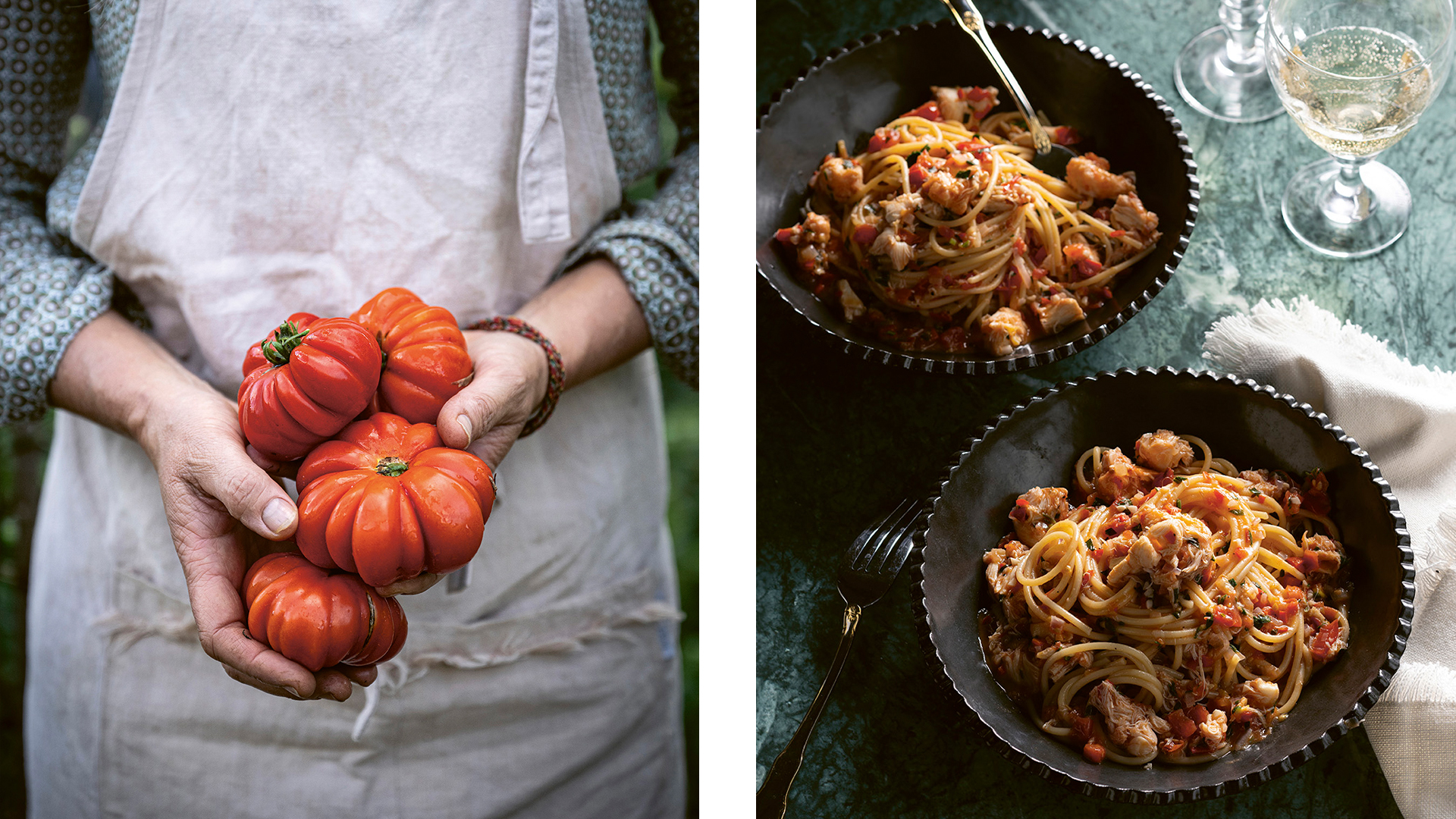 The ingredients for the sauce all come from our garden — except for the champagne, of course! The secret when cooking alcohol is to use a drink you would enjoy on its own. And if you don’t drink, it’s okay, as the alcohol will burn off during the cooking, leaving just the flavour.