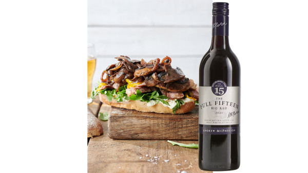 Grilled Steak Sandwich with Caramelised Onions and Mushrooms paired with McPherson Wines’ velvety smooth, Double Gold medal-winning The Full Fifteen blend.