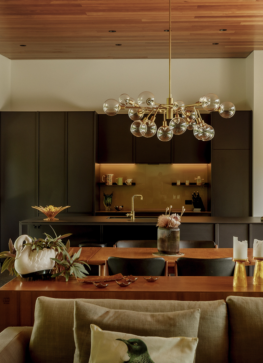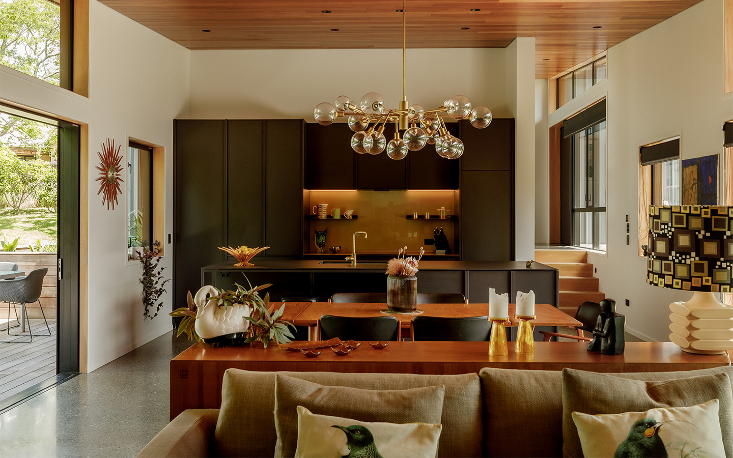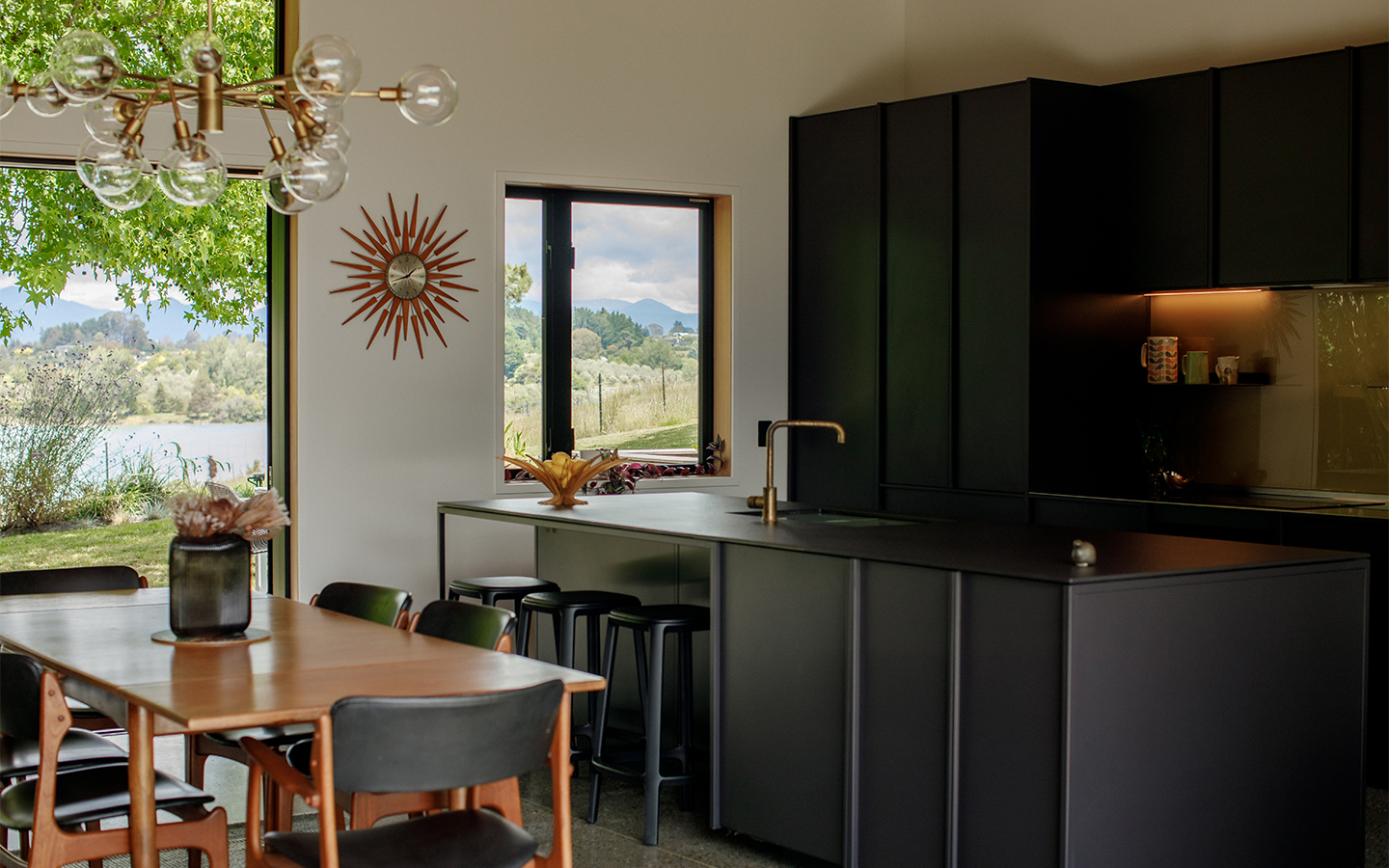 Jo says choosing a stark black for kitchen cabinetry contrasted well with the grey-white Black Haze walls and cherry beech ceiling. “To avoid a monochromatic look, and to link with the feature brass dining table pendant light and the brass tap, we chose Resene Bling Bling as the splashback colour. It’s fun and the metallic gold reflects light, giving it depth. It also works with the retro style of the house.”