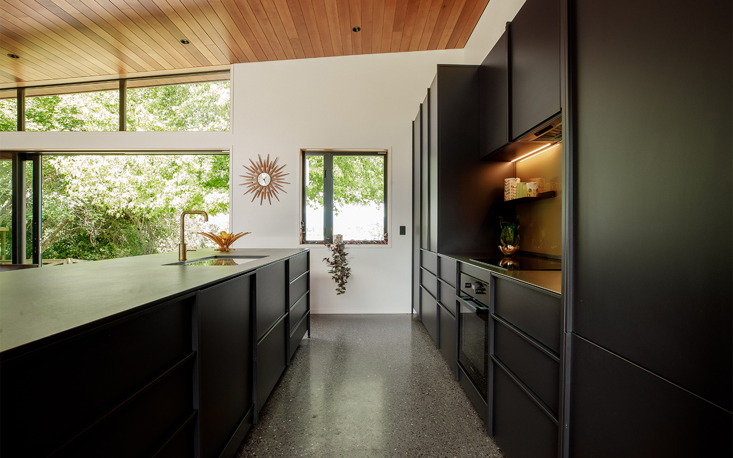 “The colour palette of more intimate spaces like bedrooms is inspired by the surrounding landscape in deep tones of green and blue, but in the main living spaces we have a neutral palette of Resene Black Haze on the walls with the timber ceiling and concrete floors. It works a bit like an art gallery, not competing with the artworks, which in this case are the views out to the surrounding nature.”