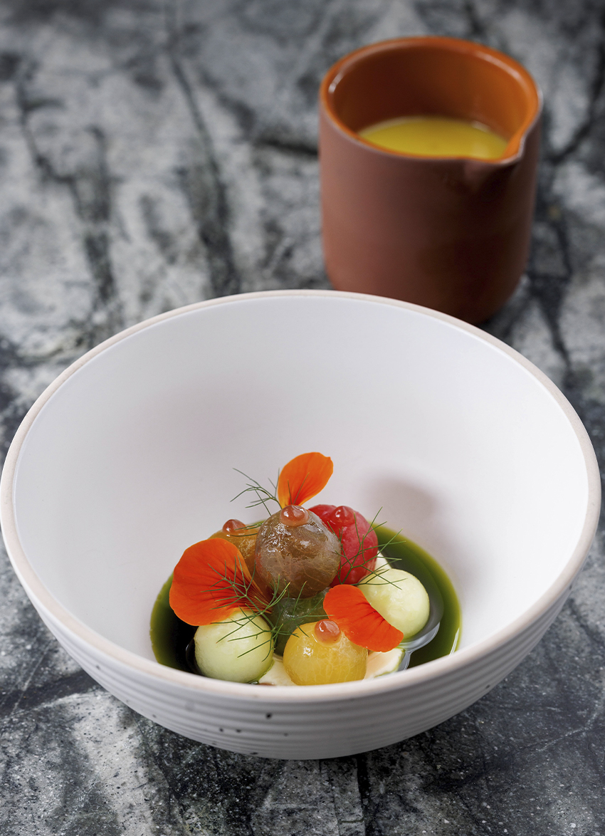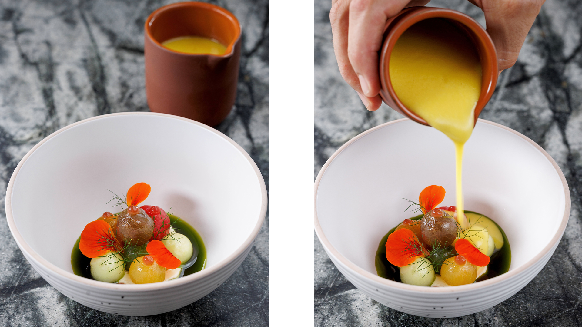 The first entrée, titled Golden Light, was a gazpacho of Clevedon tomatoes and queen peach, poured over organic jersey curd, Curious Croppers, pickled Avondale cucumber with Piha fennel oil and locally foraged nasturtium petals served with a side of crostini. This was a standout. Our next entrée, Black & White Thoughts, was named by Visit Auckland as one of the city’s 100 most iconic dishes, and it didn’t disappoint. Line-caught Leigh fish ceviche sat at the centre of the bowl, wrapped in a Kewpie-inspired mayonnaise and topped with pickled Northland daikon, Piha ice plant leaves, and a cuttlefish ink rice shard. The dish arrived with a wry explanation from Lucas, “it represents the minds of men”. Another standout dish.
