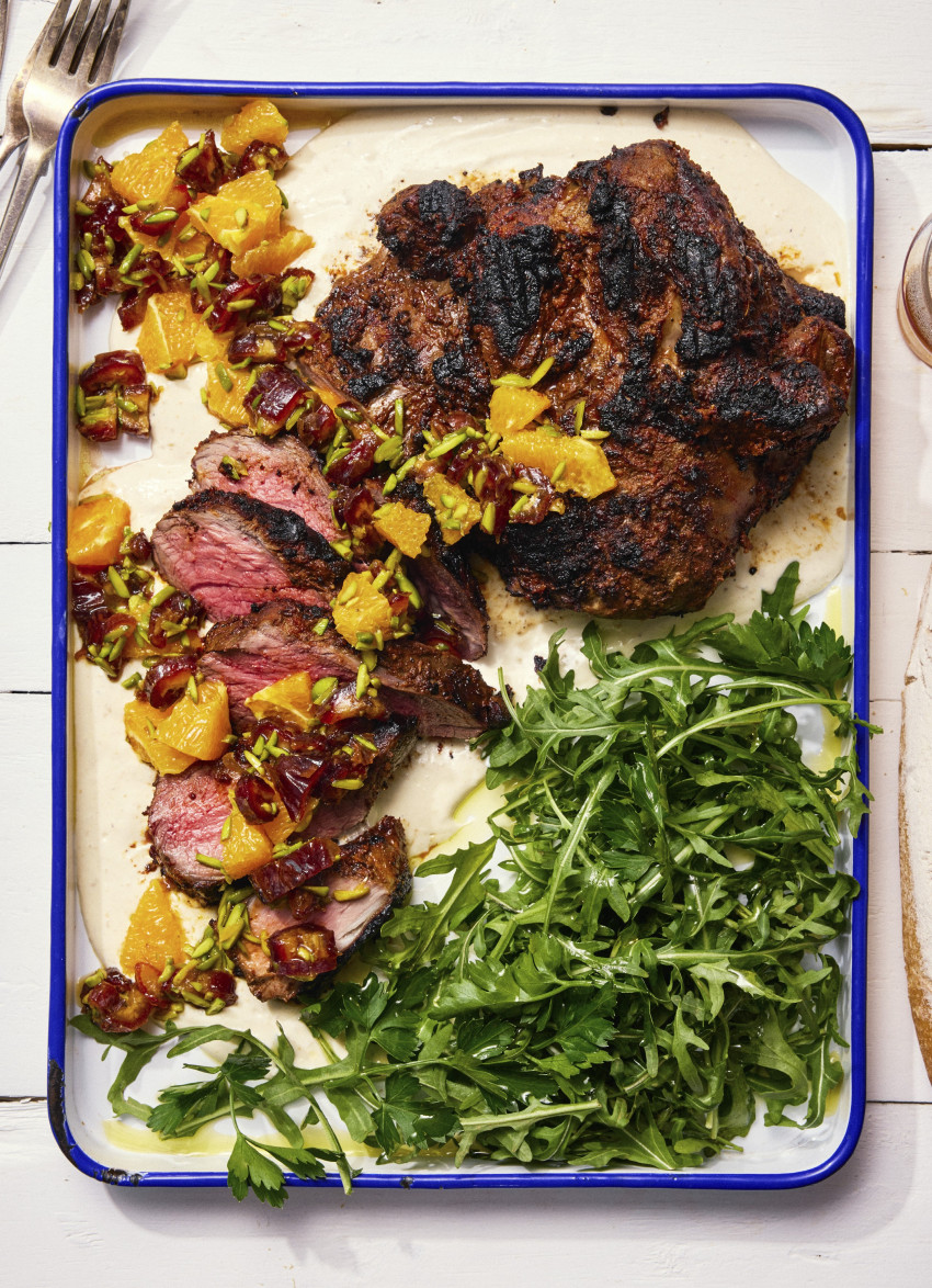 Barbecued Leg of Lamb with Date, Orange and Pistachio Salsa