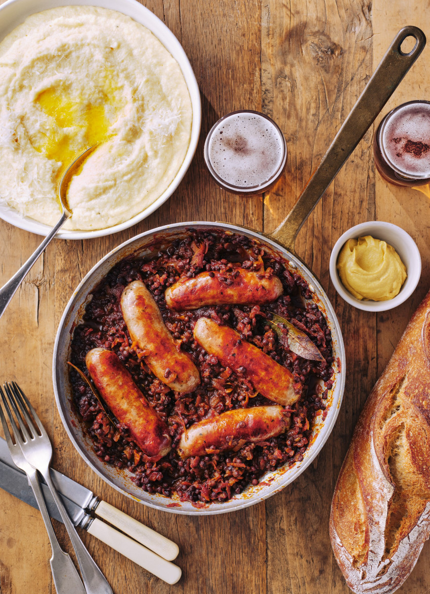 Braised Sausages and Lentils with Red Wine and Mustard