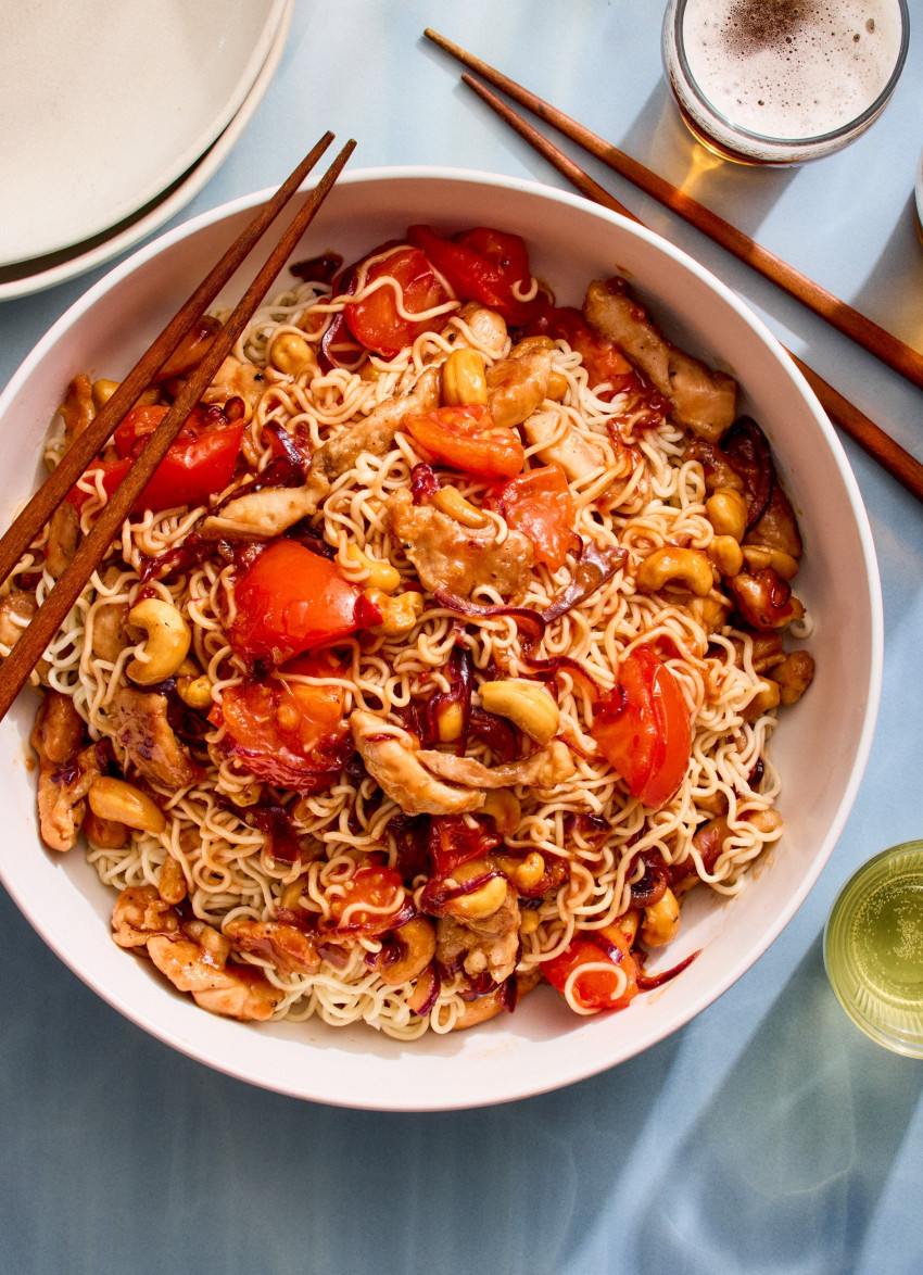 Char Siu Chicken Noodles, Tomatoes and Cashew Nuts