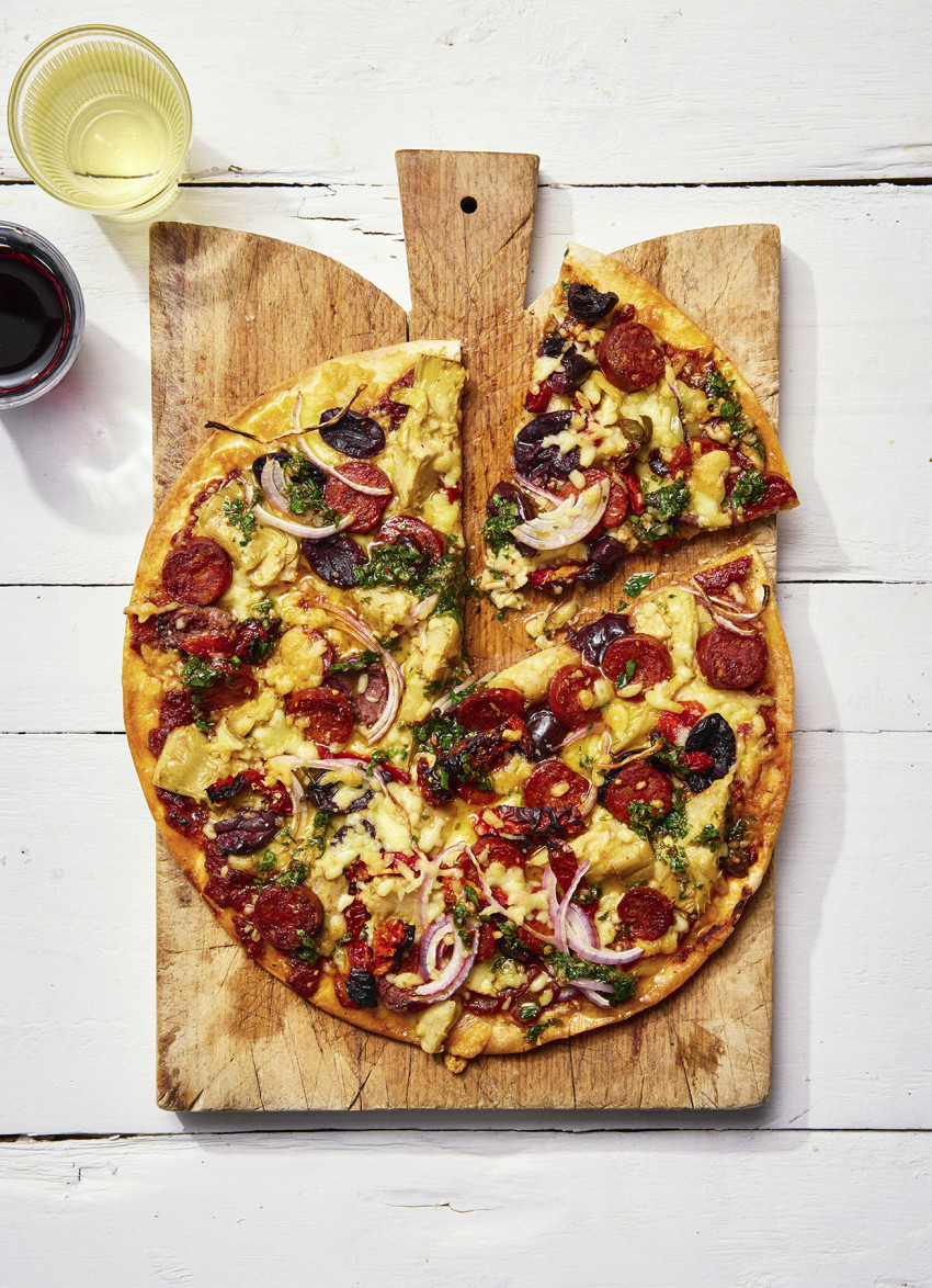 Chorizo, Artichoke and Mozzarella Pizza with Green Herb Drizzle