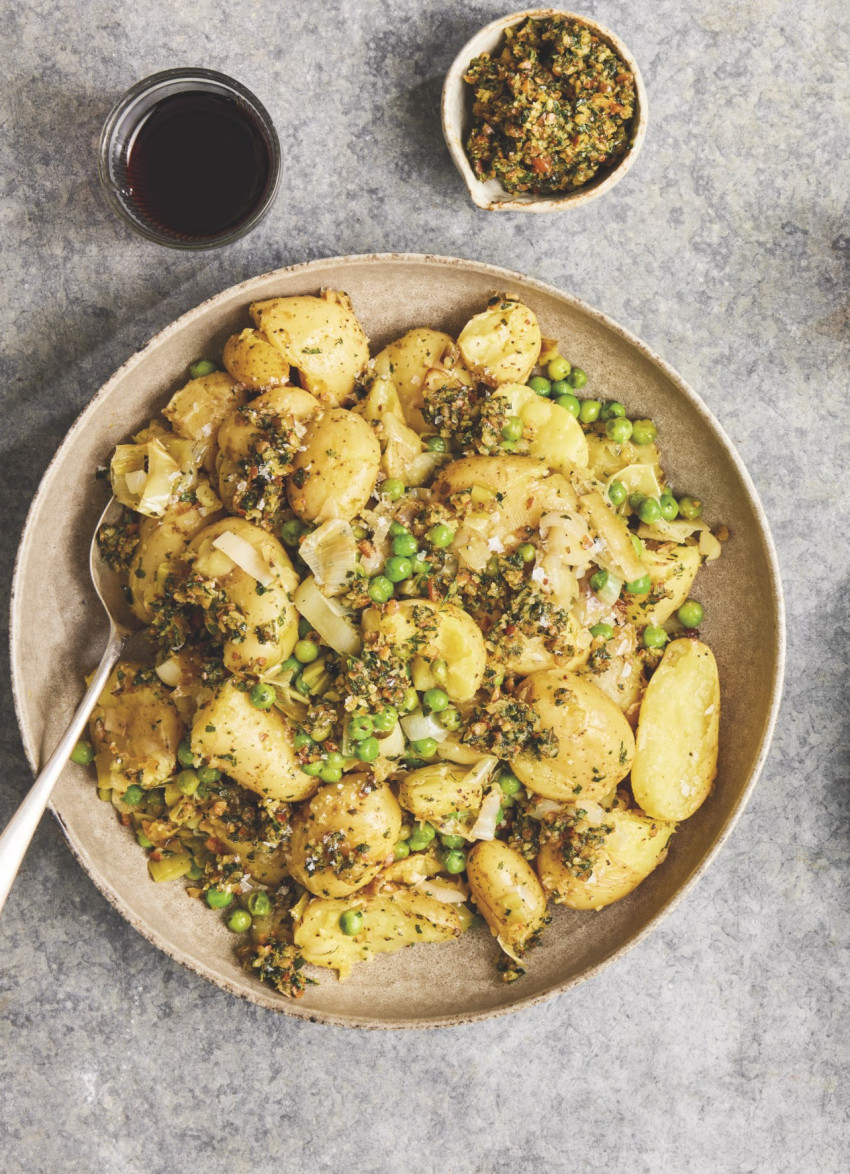 Crushed Potatoes, Leeks and Peas with Roasted Almond and Mint Pesto