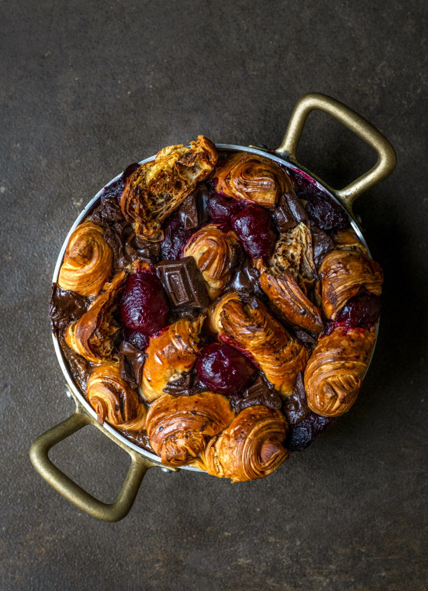Double Chocolate and Black Doris Plum Croissant Pudding