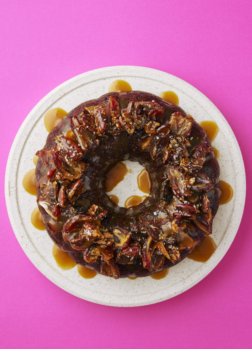 Festive Sticky Date, Orange & Fruit Mince Cake with Amaretto Butterscotch Sauce and Pecan Praline