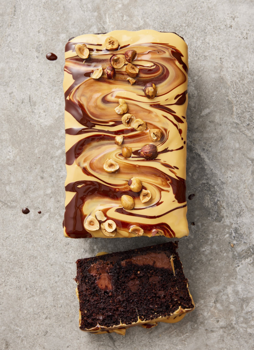 Gooey Chocolate Hazelnut Loaf with Caramelised White Chocolate Glaze
