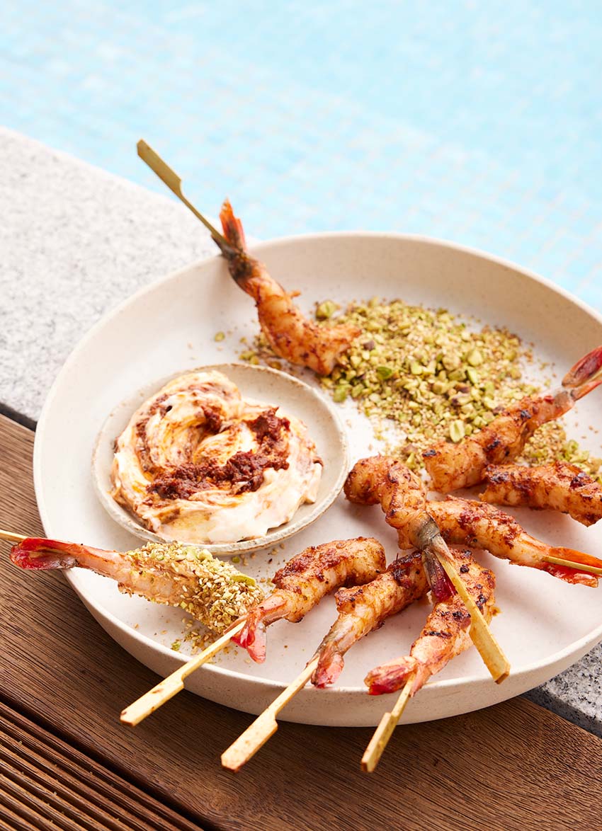 Harissa Grilled Prawns with Harissa Mayo and Pistachio Dukkah