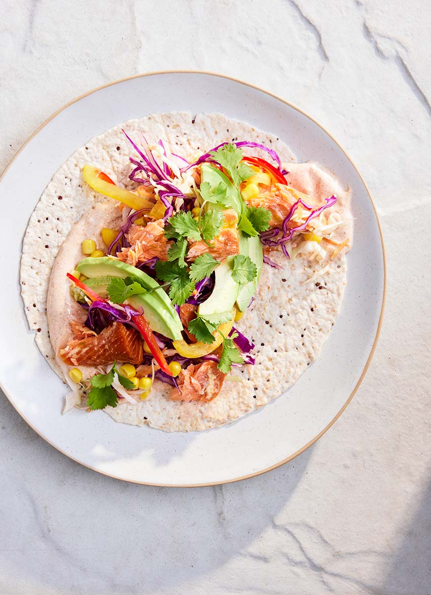 Hot Smoked Salmon, Zesty Slaw and Spicy Mayo Wraps