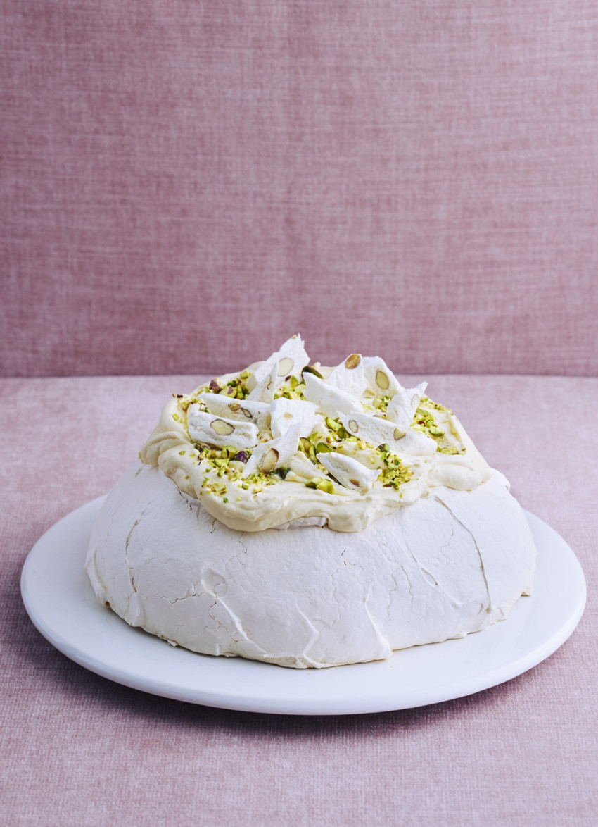 Lemon Syllabub, Pistachio and Almond Nougat Pavlova
