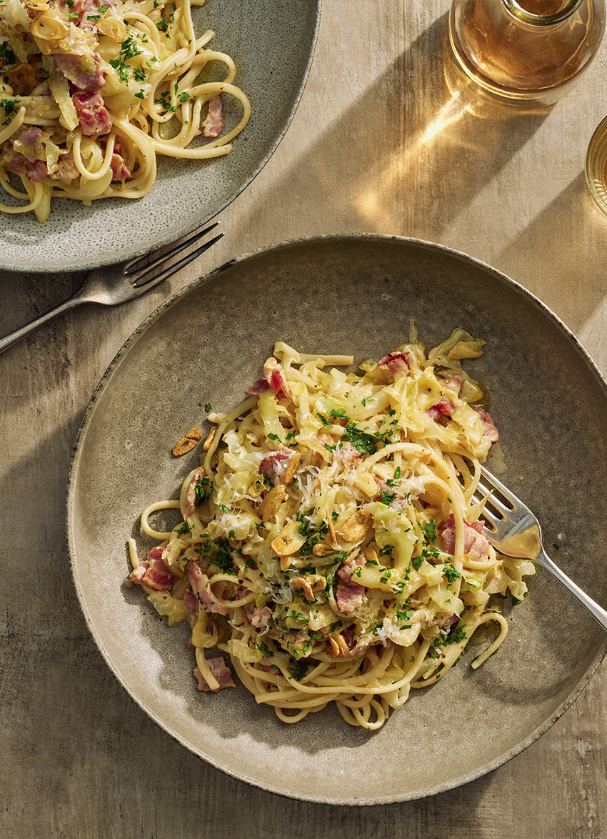 Linguine with Crispy Bacon and Cabbage
