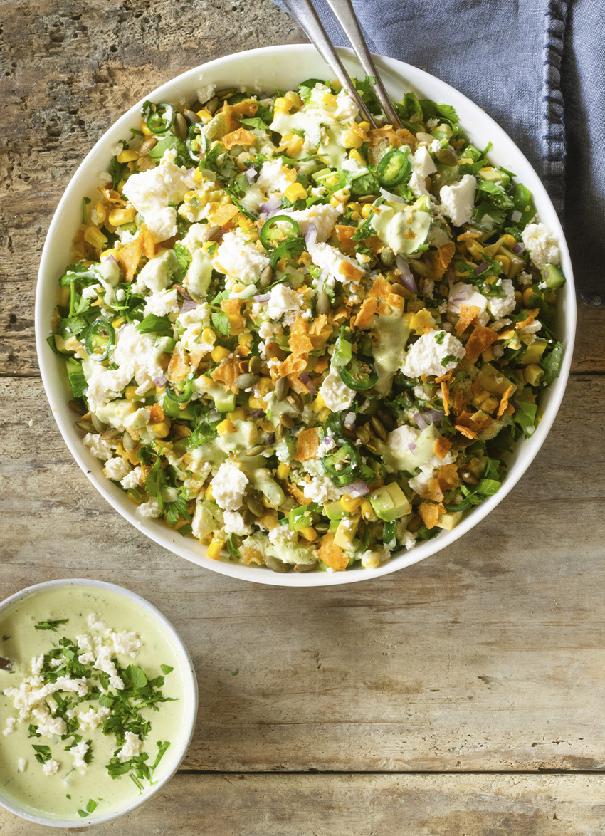 CORN SALAD: Place the pumpkin seeds on a small oven tray and bake for 4–5 minutes, until just beginning to colour.