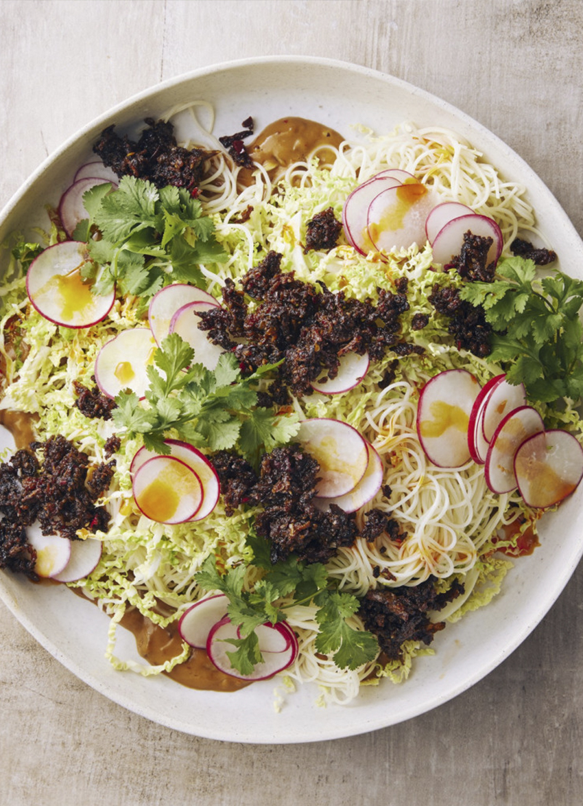 Napa Cabbage and Crunchy Radish Peanut Noodle Slaw with Cheat’s Mushroom XO Sauce