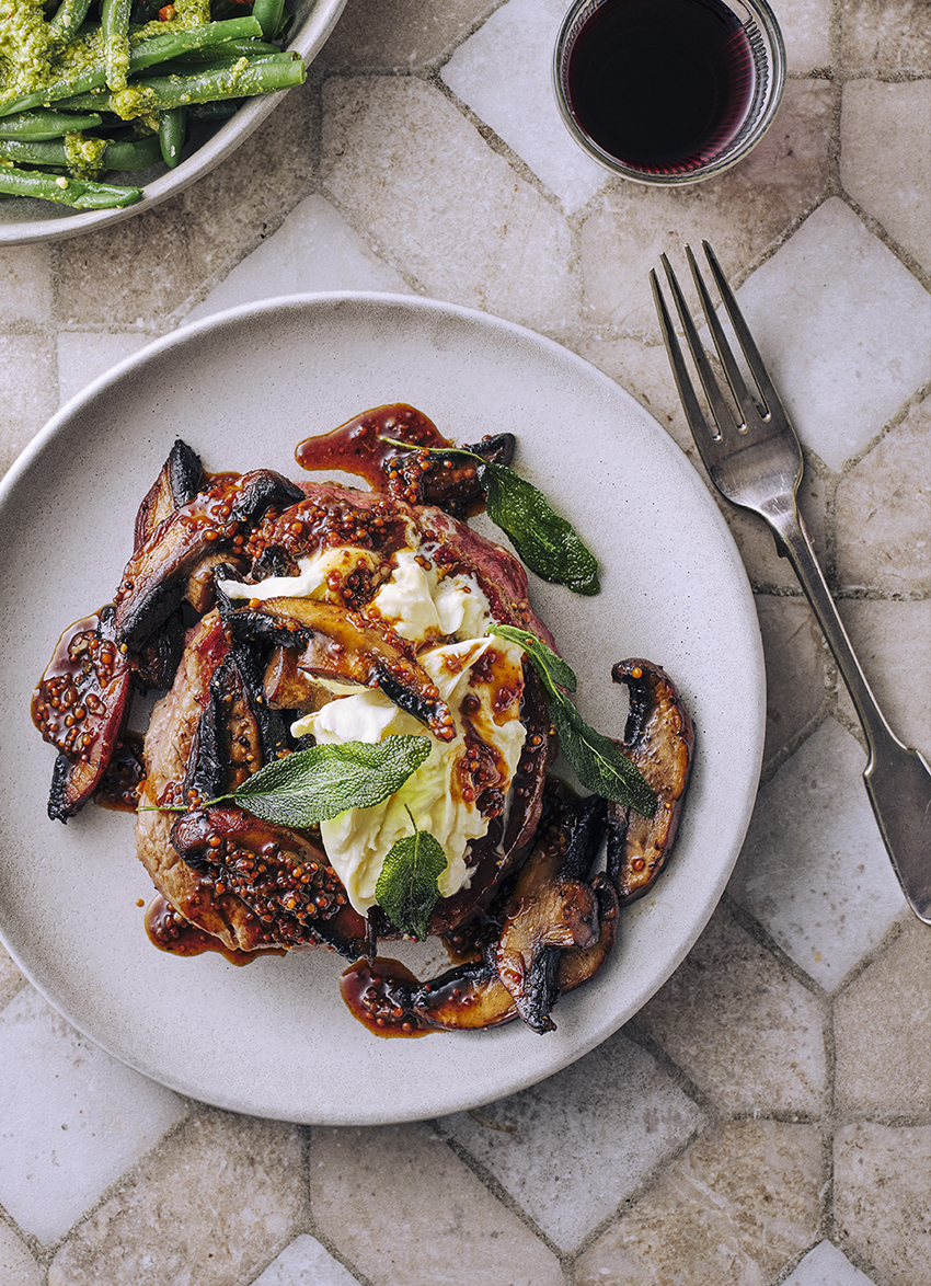 Pepper Steak with Marsala Glaze, Mushrooms and Burrata