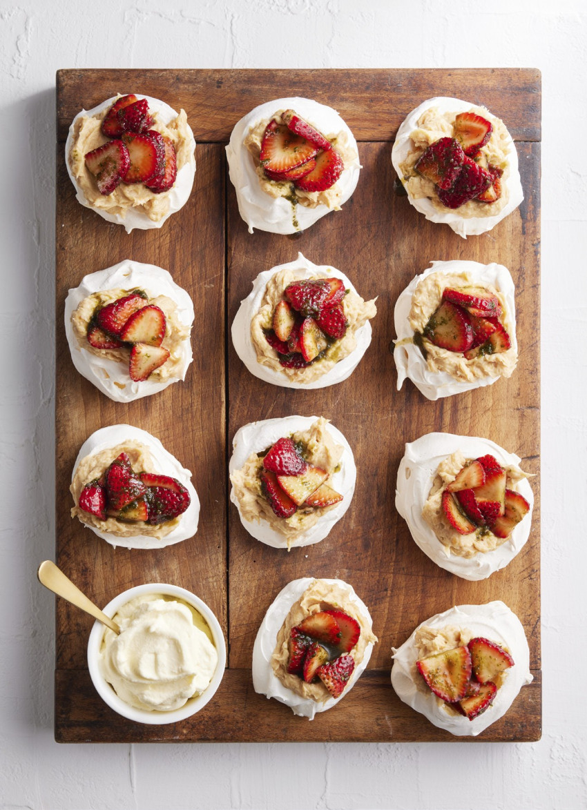PETER GORDON'S MINI PAVLOVAS WITH BANANA CARAMEL MASCARPONE, STRAWBERRIES AND BASIL