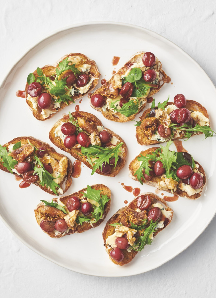 Pomegranate-roasted Grape and Blue Cheese Bruschetta with Salted Caramel Walnuts
