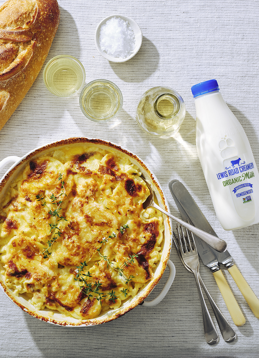 A golden, bubbling bake of pure comfort with tender potato and cauliflower simmered in Lewis Road Creamery rich organic cream and milk.