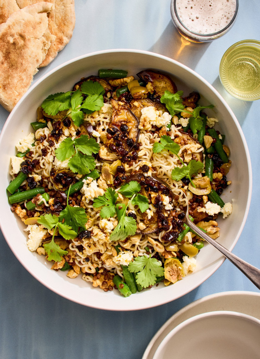 Roasted Eggplant, Noodle and Olive Salad with Pomegranate, Sesame and Cinnamon Dressing