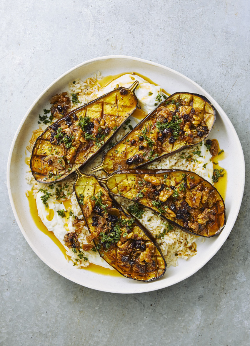 Roasted Eggplant with Warm Fennel Seed, Harissa and Walnut Dressing