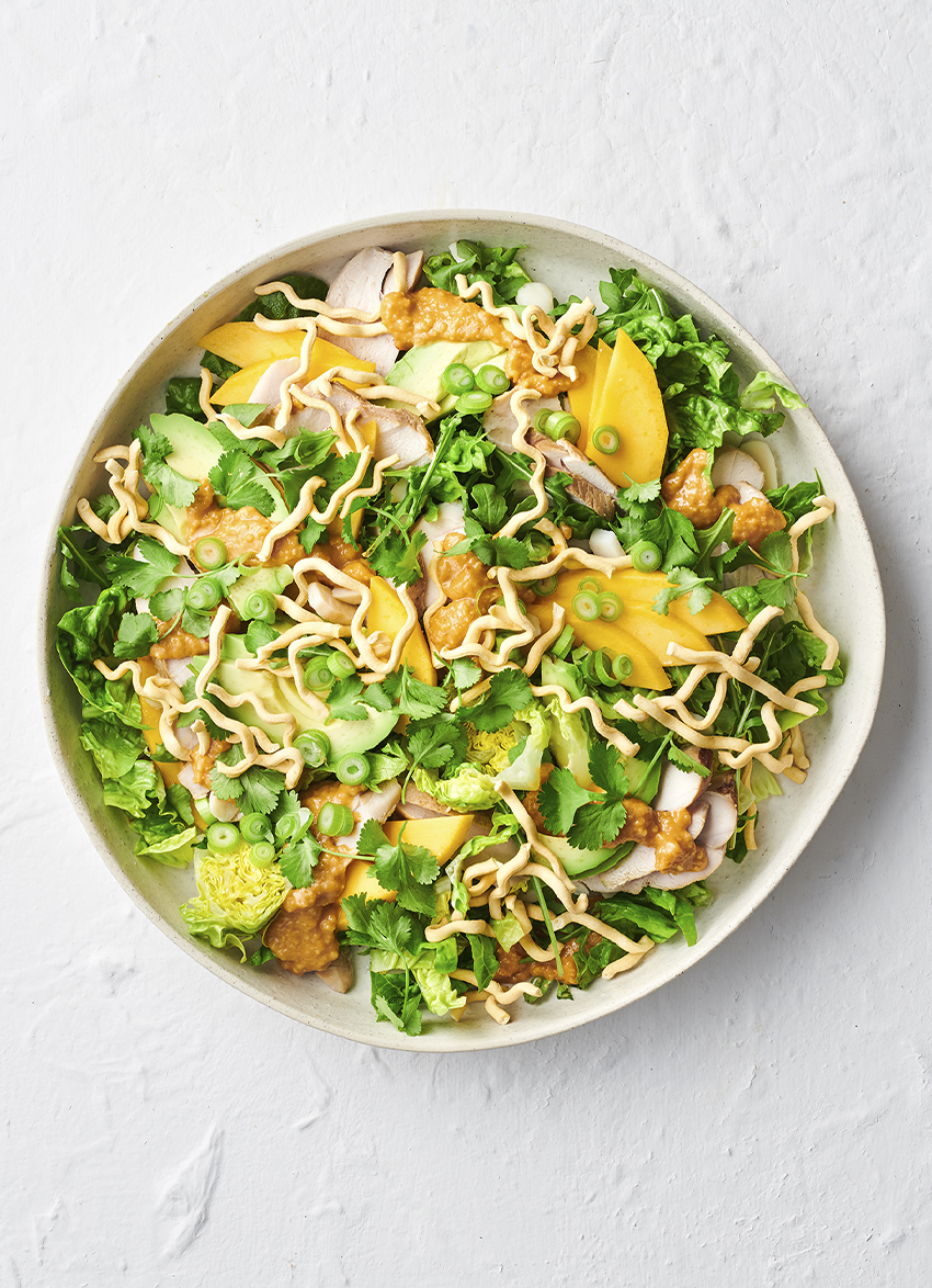 Smoked Chicken and Mango Salad with Crispy Noodles and Peanut Dressing