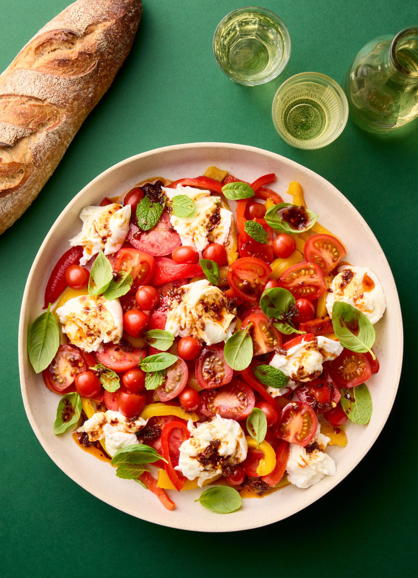 Summer Tomatoes, Roasted Capsicum and Mozzarella with Chilli Crisp Dressing
