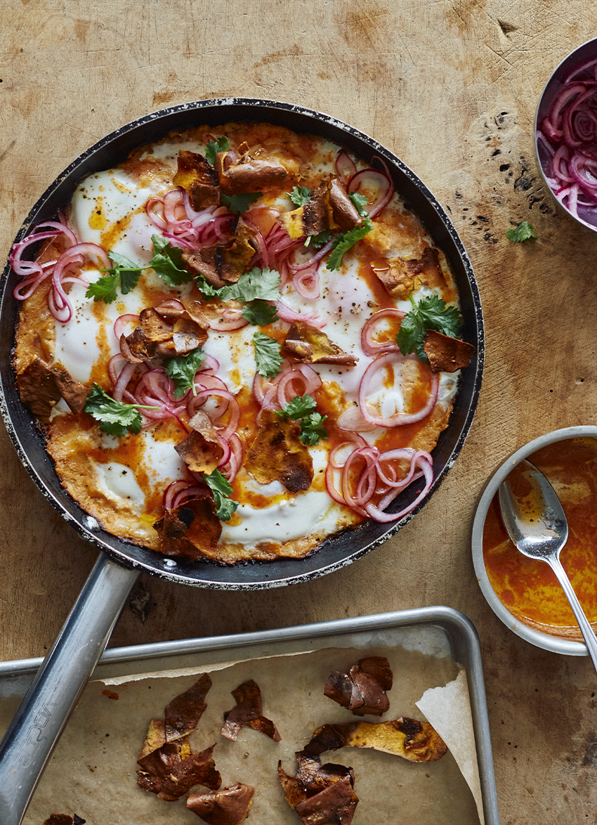 Sweet Potato Shakshuka with Sriracha Butter and Pickled Onions