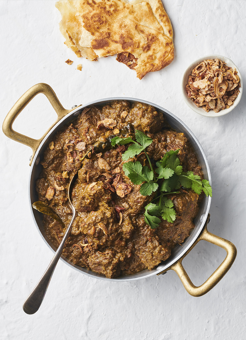After 5 hours, stir in the remaining coconut milk, tamarind paste, brown sugar, kaffir lime leaves and peanut or cashew butter. Cook a further 20 minutes, remove kaffir lime leaves and serve, garnished with coriander and Asian fried shallots, with rice and flatbreads of your choice.